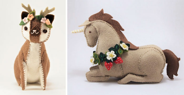 Today, my animals are made from high-quality wool felt and embroidered with wool and cotton threads. I am a biologist by day (I work with marine algae), and my animal designs are often inspired by the natural world, particularly my seahorses. I also take pride in the unique poses I’ve developed, particularly my prancing horses, and I love bringing each unique creation to life!