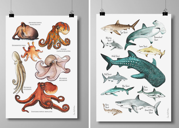 I’m a Spanish illustrator based in the UK and I created 7 posters of different animal species using pencils and watercolours. I love the ocean and its animals, and that was my main motivation when I started. I tried to show each animal faithfully, with their amazing shapes and colours. I hope you enjoy them all!