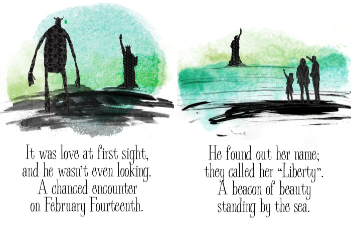 ‘Feb 14’ is an illustrated, short, quirky love story between a Giant and the Statue of Liberty. I wrote and drew the story on Valentine’s Day in 2008, 10 years ago!