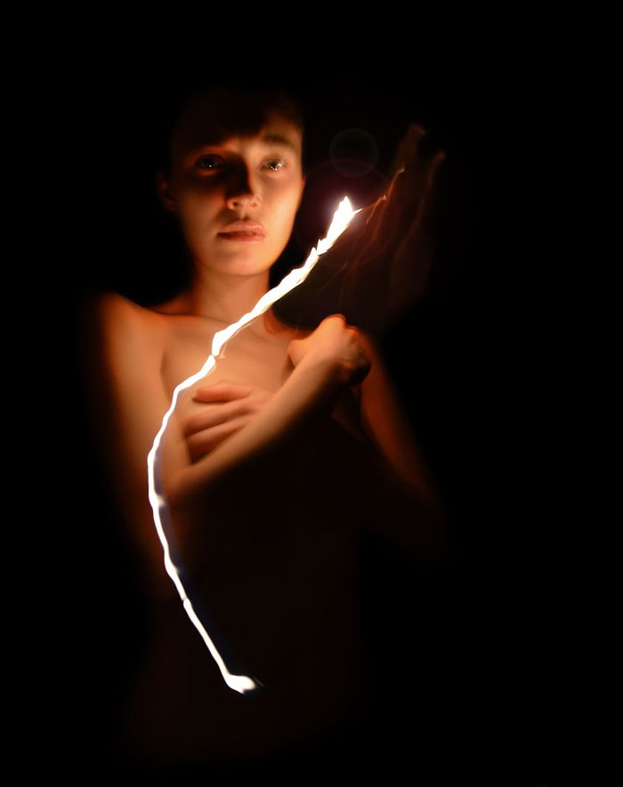 Holding the camera stationary against my chest, I then used a long-exposure photo technique and a BBQ lighter to “draw” on them, slinking the flame along the contours of their skin.