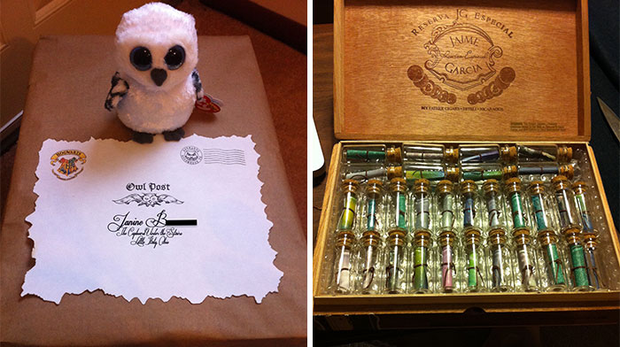 The package letter I did in powerpoint. I found the Hogwarts stamps from a simple Google search. The calligraphy was just a text box. After printing it up, I burned the borders of the paper.