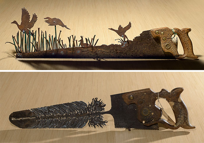 Being out of material to cut up, I needed to find more… it became like a bad habit and I needed a fix. I started hitting yard sales, looking for anything metal that I could take a torch to. I found someone selling old handsaws, 14 for $2 each, it was like making the big score. That was just over a year ago and set me on an unexpected path, I was now a Metal Artist. Starting with 14 designs I quickly built up a catalog of over 70, becoming TheSawLady. Which I have to admit I thought was a really cheesy name for a website at first… after all, I was a serious Gallery Artist, I carve trains on pencils, sometimes elephants, I paint realistic underwater murals in public places and have artwork in museums… I am NOT a Folk Artist. Over the past year I have grown partial to that name though and am now shipping recycled metal artwork to France and the UK from my little town of 236 people in Chester, Nebraska. I am now an Internationally Known FOLK Artist!