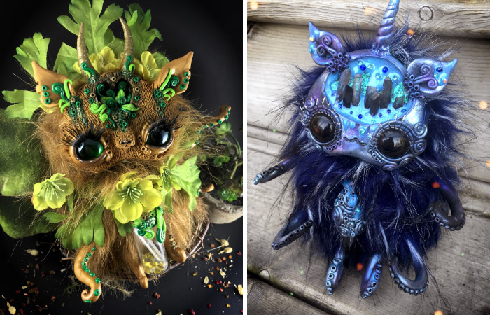 My name is Carys Woodbury, known mainly by my alias Carys Cuttlefish. I live in Edmonton, Alberta, Canada and I make these cute creatures using polymer clay, minerals, fun fur, ribbons, fluff, and pieces of my heartstrings. I can’t say for sure how long each one takes to make as it’s a labor of intense love and I get lost with each one of these fantasy animals but usually it’s about a day.