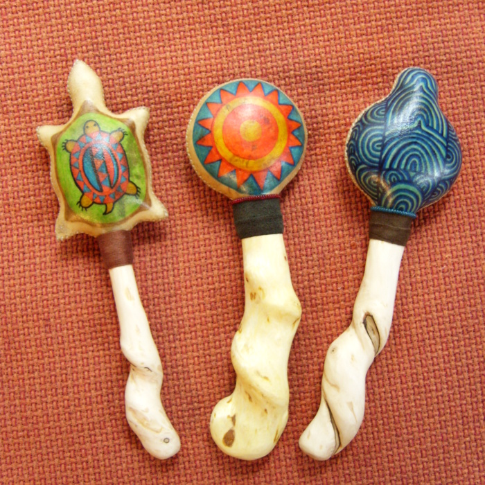 I also carve some. The rattles are individually painted and decorated. This creates very personal working tools.