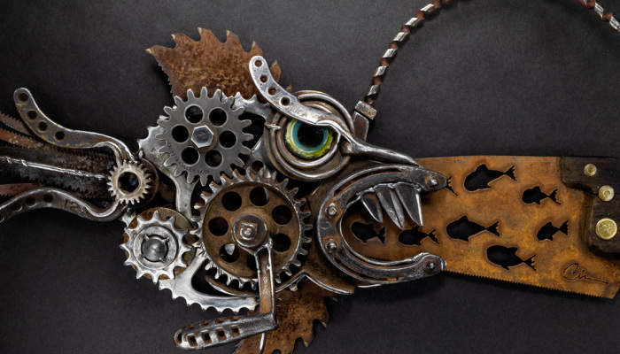 I love looking for old scrap metal that I can use in my art, and many random pieces of ‘junk’ end up in my SawFish work. Each one might take 2 or 3 days to complete, and I also make the glass eyes, which are added at the end of the build.