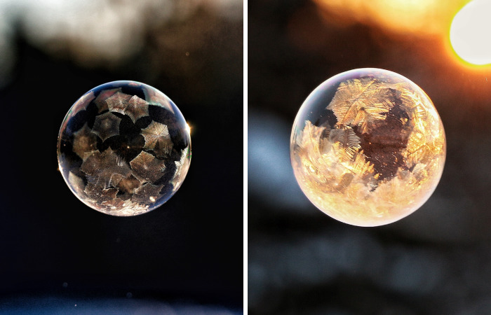 She discovered that the bubbles are freezing whilst flying when she was outside playing in the cold. She asked me to take some pictures because she thinks that they are looking like unique diamonds floating around her.