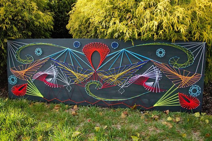 Don’t stare too hard! The shapes and bright colors contrasted with the black wood gave this mini DIY adventure a hypnotic result. I placed nails around simple, geometrical shapes on black stained wood and used embroidery floss to embellish. Drawing the shapes on attached white paper helped with nail spacing, however it didn’t look like much until the paper was removed near the end.
