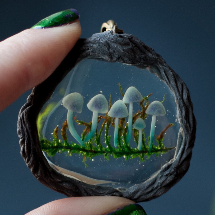 Hello, my name is Julia .Mushrooms I sculpt from polymer clay, collect the moss in the forest and tint him. I l pouring in with resin the composition I have collected – and here is the result. I hope you like my work!