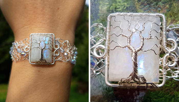 I wrapped the tree onto the stone and crocheted the bracelet part. The wire I use for crocheting is 0.3 mm