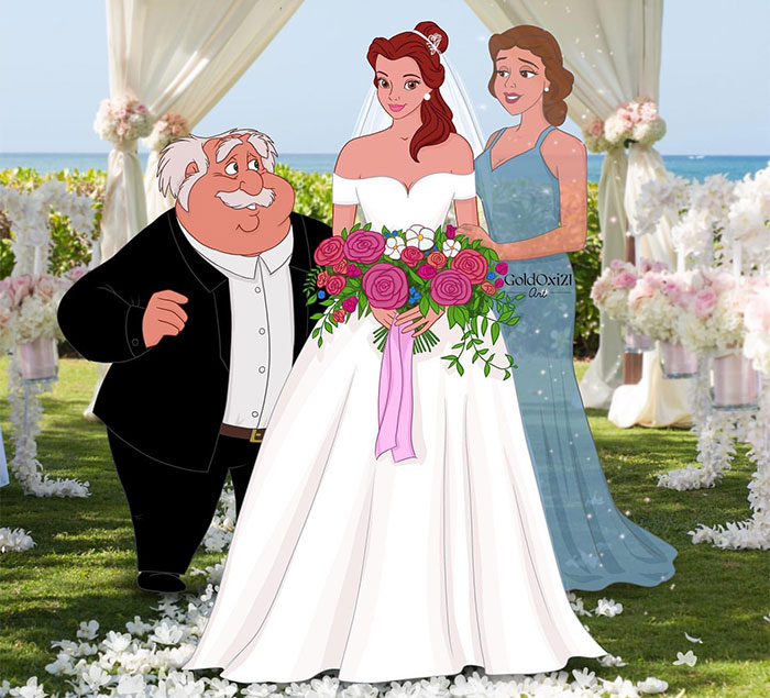 The artist drew our beloved Disney characters on the most special day of their lives—their wedding day. She adds an emotional touch to her fan art by including the brides’ parents. Even parents we didn’t get a chance to meet on-screen are present at the wedding, depicted slightly transparent as if they were spirits.