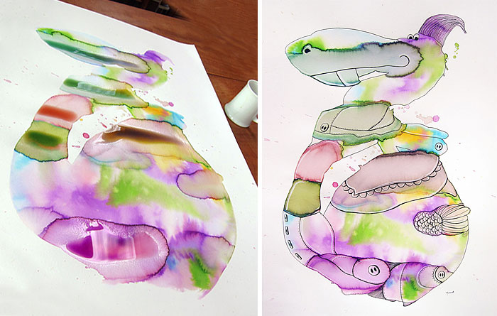 The idea came from a brief thought I had, making something spontaneous, using water to collaborate in the process. I started by painting shapes with water onto the paper, randomly adding colors to the water and letting it dry. The color paint moved, mixed and blend while drying. Once it was dry, an image appeared, very different to what I started with. I would look at the image, then draw with pen what I saw, as I saw it. I wanted the process to be freestyle and almost non-stop. I made one character and found myself with more, as I enjoyed so much.