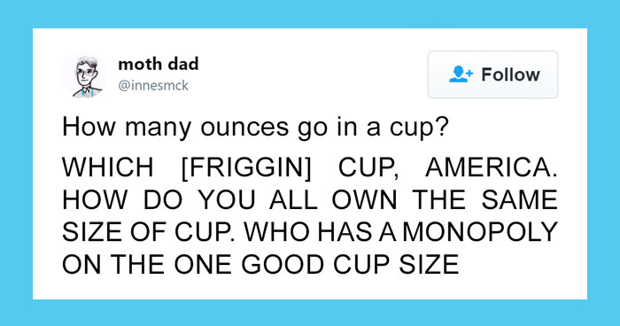 And it surely confused one funny Twitter user, Innes McKendrick, who went on quite a rant after taking a closer look at some of the measurements. “The reason I made the horrific discovery was a paragraph in Mike Clelland’s Ultralight Backpackin’ Tips book: “The math here is all done in ounces. With 16 ounces to a pound, conversion gets a little tricky otherwise, unlike that ingenious metric system”. Obviously, I was floored. SIXTEEN. Wow. I guess I figured it would be about 12, but never bothered to check given that I’m more than adequately served by the universally superior metric system” McKendrick told Bored Panda. He also went on to explain that he’d not be coming back to the topic of the imperial system as he feels he does not possess the “mental fortitude to take a second look”. Scroll down below to read what his funny tweets, and don’t forget to tells us what you think in the comments!