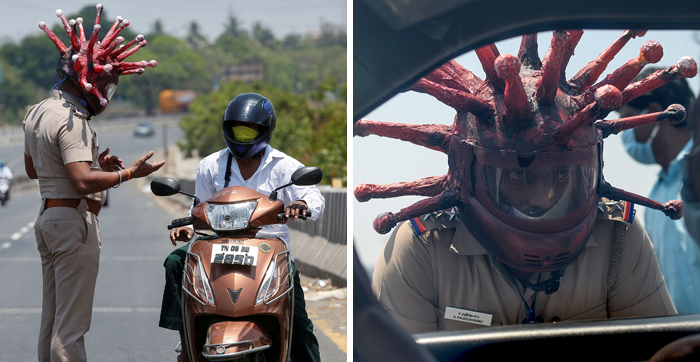 This police officer in India just took pandemic prevention to a whole new level. Rajesh Babu―an officer patrolling the streets of Chennai, the capital of the Indian state of Tamil Nadu―has gone viral on social media for wearing a helmet that looks just like coronavirus.