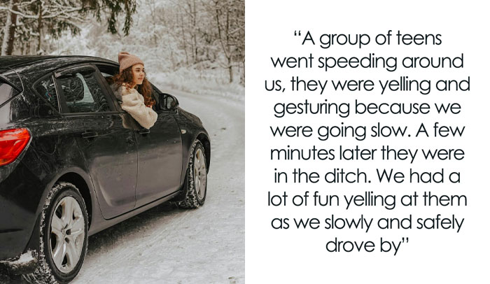 As a group of teenagers driving on a back road at night, in the snow, we were going pretty slow and a group of other teens went speeding around us and they had their windows rolled down and were hanging out, yelling and gesturing, being obnoxious because we were going slow. We went around a corner a few minutes later and they were in the ditch. We had a lot of fun yelling and gesturing at them as we slowly and safely drove by.