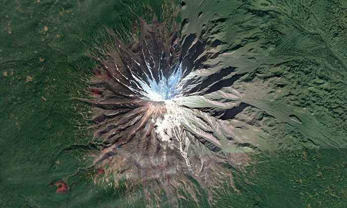 “A beautifully symmetrical volcano on the Kamchatka Peninsula in Russia. Look at those weird red cinder cones on the flanks.”