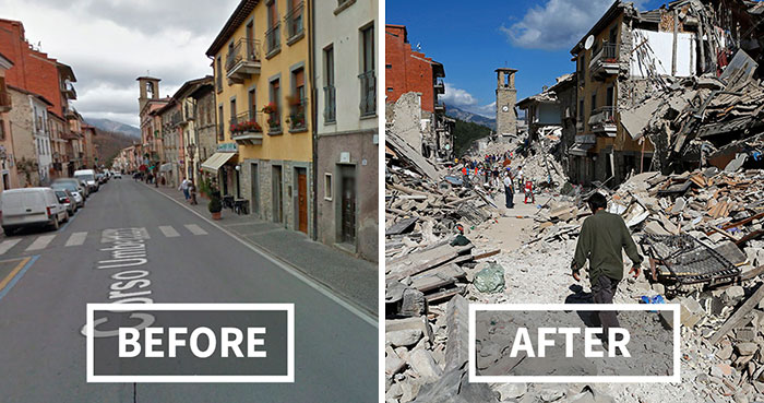 At least 247 people are so far reported to have been killed in the devastating earthquake that hit Italy on Wednesday. The epicenter of the recent earthquake of 6.2 magnitudes was in Norcia, Umbria, approximately 100km north-east of Rome, and towns including Amatrice, Accumoli, and Pescara del Tronto have been severely damaged by the natural disaster. It’s only when you look at these before and after pictures however that you can really begin to understand the true level of destruction.