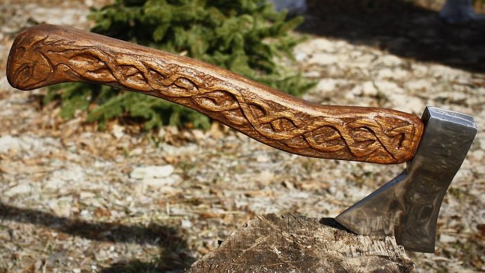 I had old axe which needs to be repaired. I also have free evening and nothing to do so I took some beer and started the renovation. Before I realized how far I went with the carvings it was to late to stop. I polished the blade to be like mirror and now I have great looking tool.. but it was hard to do first chopping, because I was worried that I would ruin all my work :) Fortunately tools is working great and still it looks perfect.