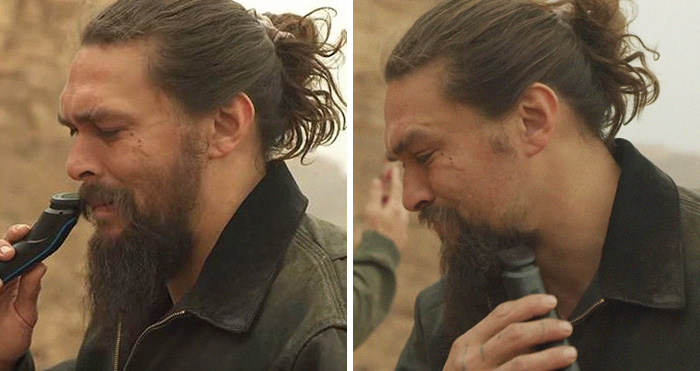 Bidding farewell to the various bearded characters he has played, Momoa is shown trimming up with an electric razor while in a remote desert location. He also takes the time to show us some canned beverages which turn out to be water, because shaving in the desert is thirsty work. He delivers a salutary message about recycling and not using plastic bottles and voila, the beard is gone.