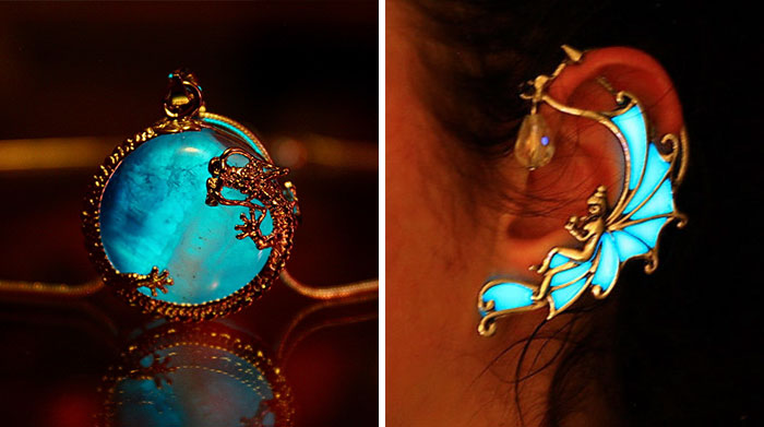 Canadian jewelry designer and photographer Manon Richard creates a luminous glow in unique jewelry and accessories. Sold on Etsy, each beautiful artwork is hand made and makes you feel truly magical. The secret to her mysterious touch? Richard applies luminous phosphorescent paint to each handmade jewelry piece, which creates a turquoise glow when ‘charged’. The phosphorescent paint is charged by holding the work of art under a lamp for a few minutes or in the sun for a few hours.