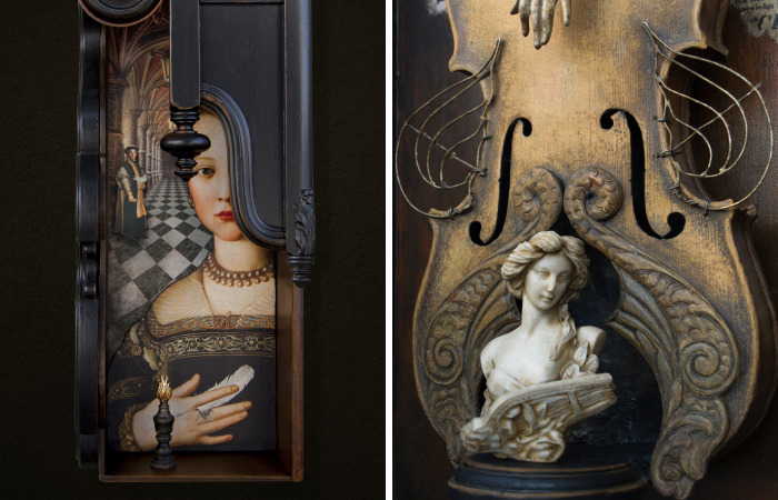 Mixed media assemblage, student violin, mirror frame, composite marble statue, 27″h x 16″w x 8″d.