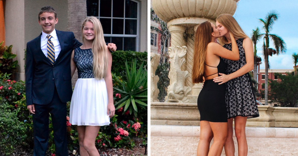 In the first pic is her and her old friend Dylan, back in freshman year and all dolled up, but with a body language that suggests that romance is not on the cards. Nevertheless, they were and remain great friends. It was the ‘now’ pic that has resonated with people. Confident, carefree and clearly in love, Caitlin is kissing her girlfriend Kirrin Chew, who she has been dating for a year now.