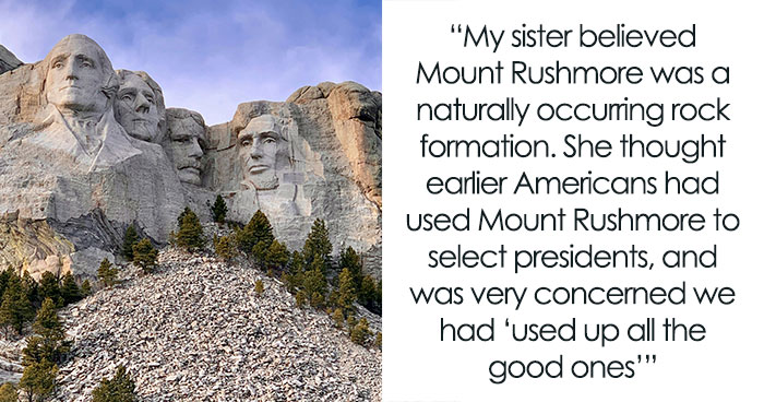 Until she was in her mid-twenties, my sister believed Mount Rushmore was a naturally occurring rock formation. Until somewhere in her teen years, she thought earlier Americans had used Mount Rushmore to select presidents, and was very concerned we had “used up all the good ones.”