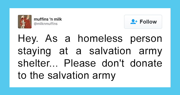 According to their 2017 financial report, The Salvation Army–USA received over $2 billion from direct public support that year. Heather Snow, a homeless woman who had been living in one of their facilities, however, said nobody should donate a single penny to them ever again. She shared an emotional twitter rant about the ‘abusive’ experience she and other women were having in one of Salvation Army’s centers in Portland, saying the sole purpose of the organization is to make a profit (in 2017, it reported a surplus of $622M). The thread ignited a discussion where others responded that one rotten apple doesn’t mean the entire tree is bad. Scroll down to read the debate and leave your opinion in the comments!