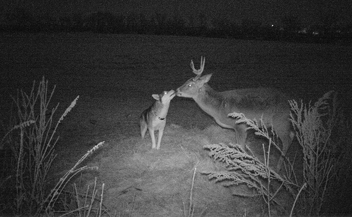 Not only did the cameras pick up Koda, but they also picked up her new, unlikely friend – a male deer. The buck can be seen huddling up next to the husky, as well as eating and napping with her. For the entire evening, Koda can be seen playing and just spending time next to the buck who didn’t seem bothered by her presence at all.