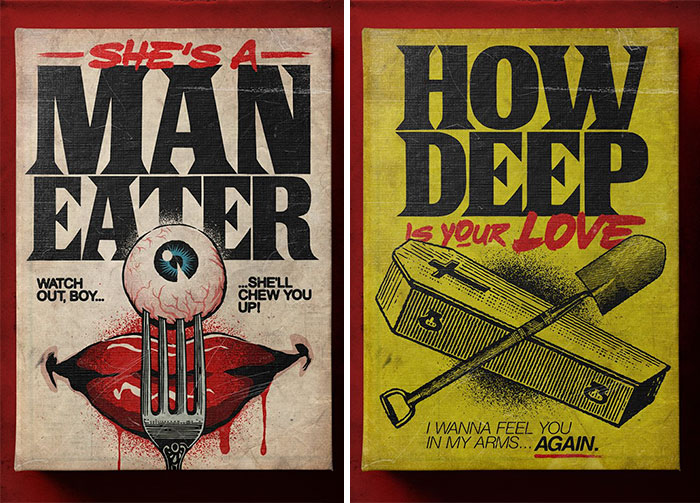 “This series imagines an alternate universe where some of the most desperate and tragic romantic songs in the ’70s and ’80s are actually horror books written by Stephen King. The concept is to look at the dark side of love by the vision of pop culture, bringing aspects of its classic stories to play the true meaning of the songs – this can be completely subverted or stressed strangeness while paying tribute to the vintage book cover designs of the original horror stories,” Butcher writes on his Behance.