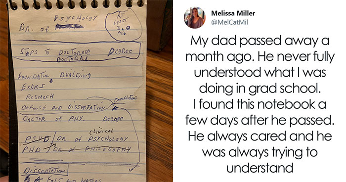 A few days ago, Twitter user Melissa Miller shared a picture of a notebook that her deceased dad had kept a secret. The wrinkly pages, full of cross-outs and arrows acted as a compass, helping the man to navigate his daughter’s academic career in clinical psychology.