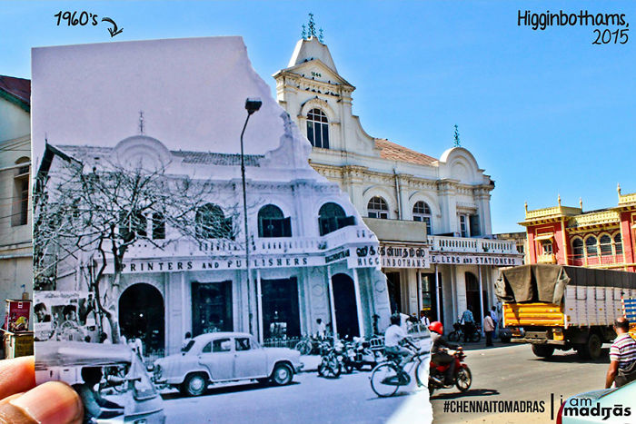 Then: Another shot of India’s then-largest bookstore as vintage cars park comfortably, and its occupants to grab their favourite literary classics. The building next to Higginbothams is Poompuhar, the popular textile shop.