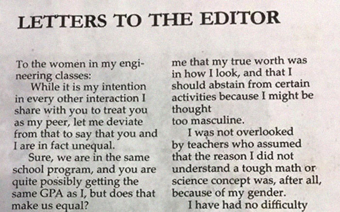 Imagine a guy telling his whole engineering class, loud and clear, that female students aren’t his equals. As I’m typing, your eyeballs might be out of their sockets, and you might be searching for an egg or two to fire. While your mind is busy creating the worst-case scenario of academic misogyny, stay with me. The guy suddenly changes his tone of voice – “you and I cannot be equal. You have already conquered far more to be in this field than I will ever face.” Of course, the female students had to work harder, stronger, better and faster to make it in this world! And what were you thinking? In the blink of an eye, Jared Mauldin transforms into a humble hero of modern class. His thought-provoking letter, published on Eastern Washington University’s student news site, has been taking the internet by storm. No thunder, though, as many have turned to him to say “thank you”. Read Mauldin’s full letter below: