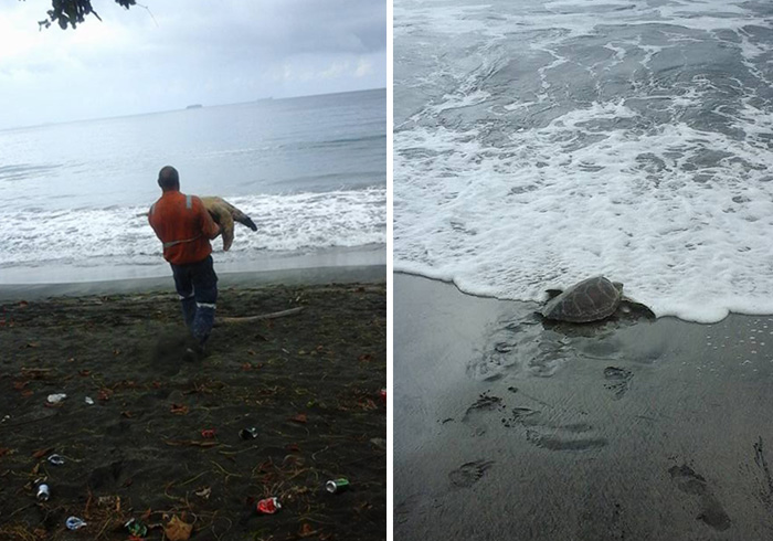 Two lovely sea turtles meant to end up as a fine meal in Papua New Guinea were luckily spared. Arron Culling and his co-worker Mark bought them from a local food market and released them back to where they belong – the sea.