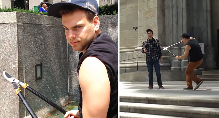 Meet Buddy Bolton – a Youtuber who runs around NYC destroying peoples’ selfie sticks with a branch cutter.