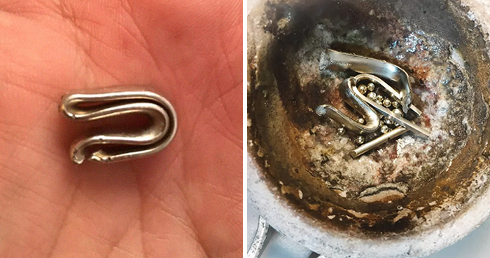Molten gold is poured into the flask, perfectly fills the void and assumes the shape of the original wax ring model. A bit of excess gold is needed to fill the sprue portion. The rest forms a “button”. It’s always good to use a bit extra metal when casting to ensure the jewelry piece comes out as a complete cast.