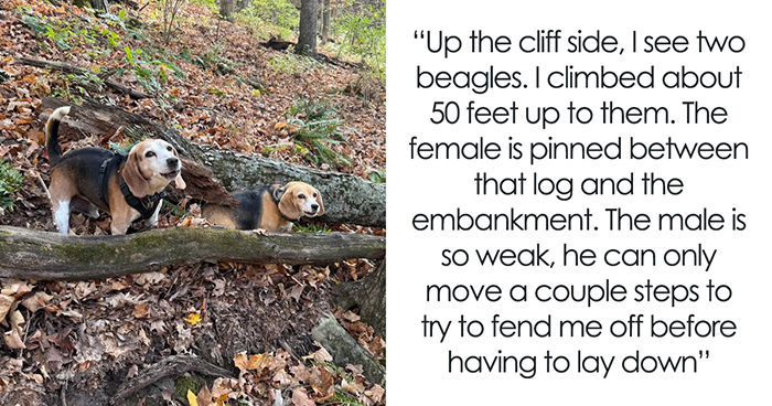 At first, no one was in sight, so the author decided to investigate. After climbing up the cliffside, the man came across 2 beagles, one of which was pinned under a pretty big tree branch.