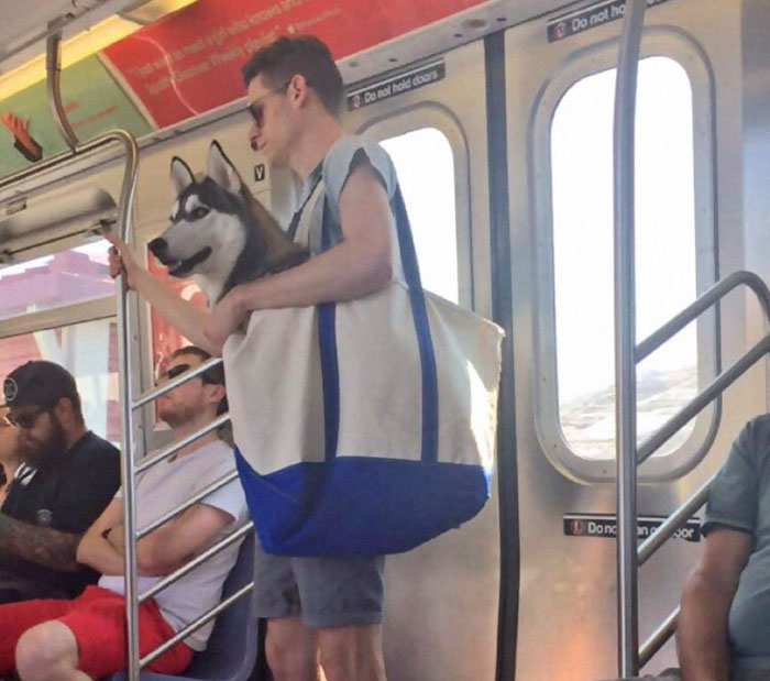 This guy avoided a fine on the New York subway by putting his huge husky into a tote bag