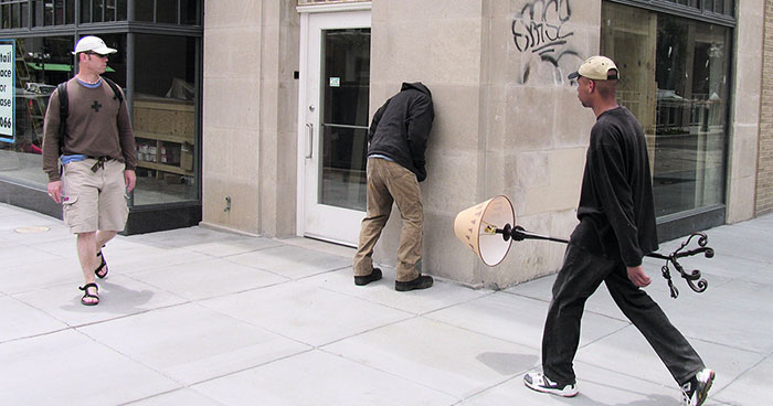 American street artist Mark Jenkins is the name behind the faceless figures popping up in cities around the world. Staged in provocative poses, his startlingly lifelike mannequin art installations are often social critiques meant to challenge the viewer to question their reality and raise social awareness. In what he dubs urban theater, these realistic sculptures provoke an array of reactions that transform his installations into multi-layered performance art.