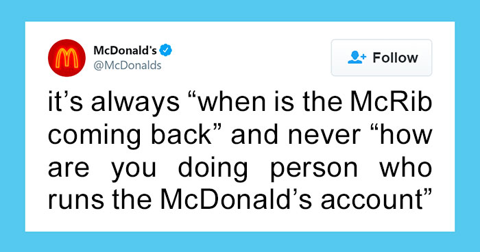 So, around a week ago, the official McDonald’s Twitter account posted what could be called a mini rant mixed in with a plea for empathy. It read: “it’s always ‘when is the McRib coming back’ and never ‘how are you doing, person who runs the McDonald’s account.’”