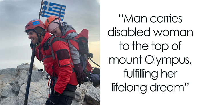 Man carries disabled woman to the top of mount Olympus, fulfilling her lifelong dream