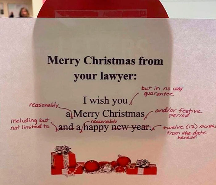 For quite some time lawyers and their clients have been sharing a hilariously edited greeting. Supposedly written by a lawyer, this Merry Christmas card has probably the most ‘reasonable’ holiday wishes.