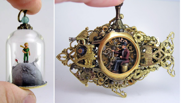 My name is Gregory Grozos and I specialize in making miniature worlds inside handmade jewelry pieces. A few years ago I had the idea of making an entire tiny world which a person can carry on him or her. I then started developing jewelry designs to do exactly that. My work is very painstaking and most unique jewelry pieces take days or even weeks to complete.