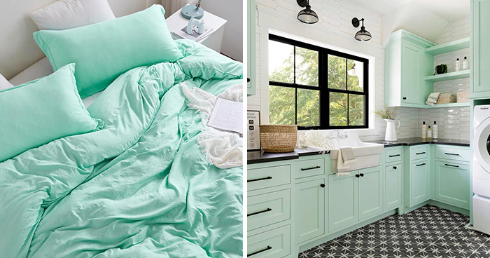 Design your bedroom by adding mint green bedding and accent pillows. Shades of mint green help to create an extra calm and inviting mood. You can choose from different types of bedding, such as comforters, duvets, or sheets with mint green as the primary or accent color.
