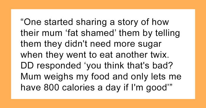 Someone began sharing their own story and said that their mother fat-shamed them by saying that they didn’t need more sugar when they reached out to grab another chocolate bar; the woman’s daughter then responded by revealing that her mom only lets her have 800 calories a day.