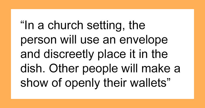 In a church setting, the person will use an envelope and discreetly place it in the dish. Other people will make a show of openly their wallets