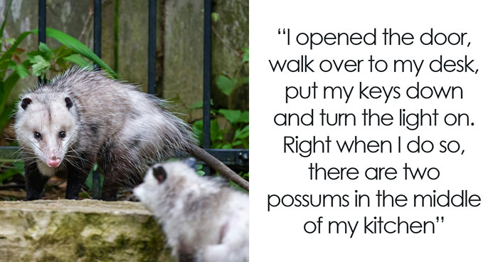 At the time I was working until 1am so I wouldn’t get home until 2 or so. I opened the door to the house and felt what I thought was a breeze come by my leg. I don’t really pay attention, walk over to my desk, put my keys down and turn the light on. Right when I do so, there are two possums in the act of mating in the middle of my kitchen. They screamed, I screamed and we began the three hour dance of getting them out of my house. I ended up trapping them in a dog cage and dumping them out in the middle of my back yard.