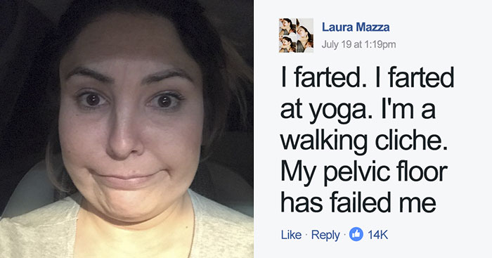 This working mom blogger named Laura Mazza has muscle separation and is trying to get in shape, so her doctor recommended trying yoga to better her muscle tone. Unfortunately, when Mazza came to her first class, it was a complete disaster. Despite the fact the everyone in her class had nice tight yoga pants and perfect pedicures while Mazza was showing off her “froddo feet” and hairy toes, she had a cringeworthy incident… “Somewhere between the dolphin and the three-legged dog yoga positions, two of those burning garbage eggs slip out, and I let out a stinky fart,” Mazza shares. “I farted. I farted doing yoga poses. I’m a walking cliche. My pelvic floor has failed me.” Fortunately, it was quiet, and just maybe nobody noticed my farting in public. But what happened next… It’s so mortifying it will make you cry with laughter! Keep on scrolling to find out!