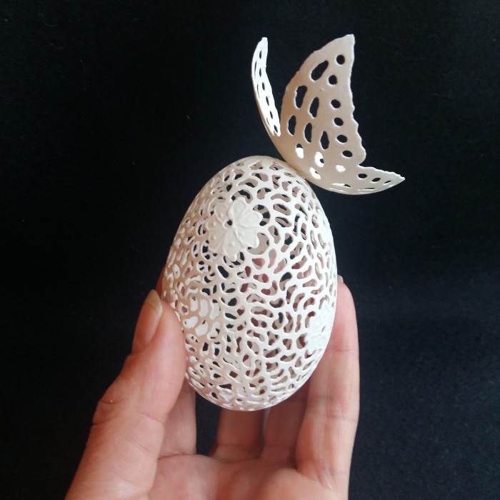 I really love cutting different patterns on the eggshell. Once I broke an egg, on which the contour of a butterfly was cut. Then I saw that the butterfly waved its wings upward. Oh idea !!!. Then I had a collection of eggshell items with butterflies, dragonflies and I plan to cut the bees as well. And I also like to improvise sharply. I take an egg and without a stencil I cut out intricate patterns – it turns out very interestingly.