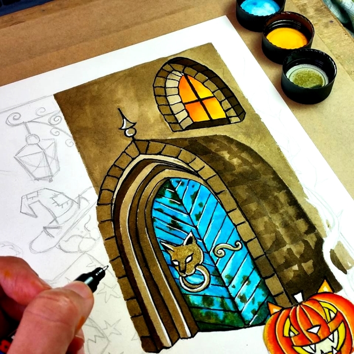 The original painting is a commissioned artwork to one of my Collectors, made in the style of my colorful Cats of Karavella Collection. It is a mixed media painting on 100% cotton paper, mainly made by Ecoline brilliant watercolor ink, Gold Gouache, and permanent markers. The specialty of this artwork is that I also applied acrylic fluorescent paint to certain areas, so that the painting would glow in the dark, and reveal a magical night scene!