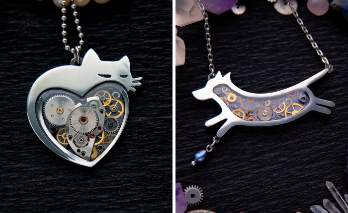 For the last few years my cousin Victoria has been buying old and broken watches at flea markets and turns them into real art objects. Every detail in gear composition is placed by hand, each jewerly piece takes from 2 to 14 hours of laborious work.